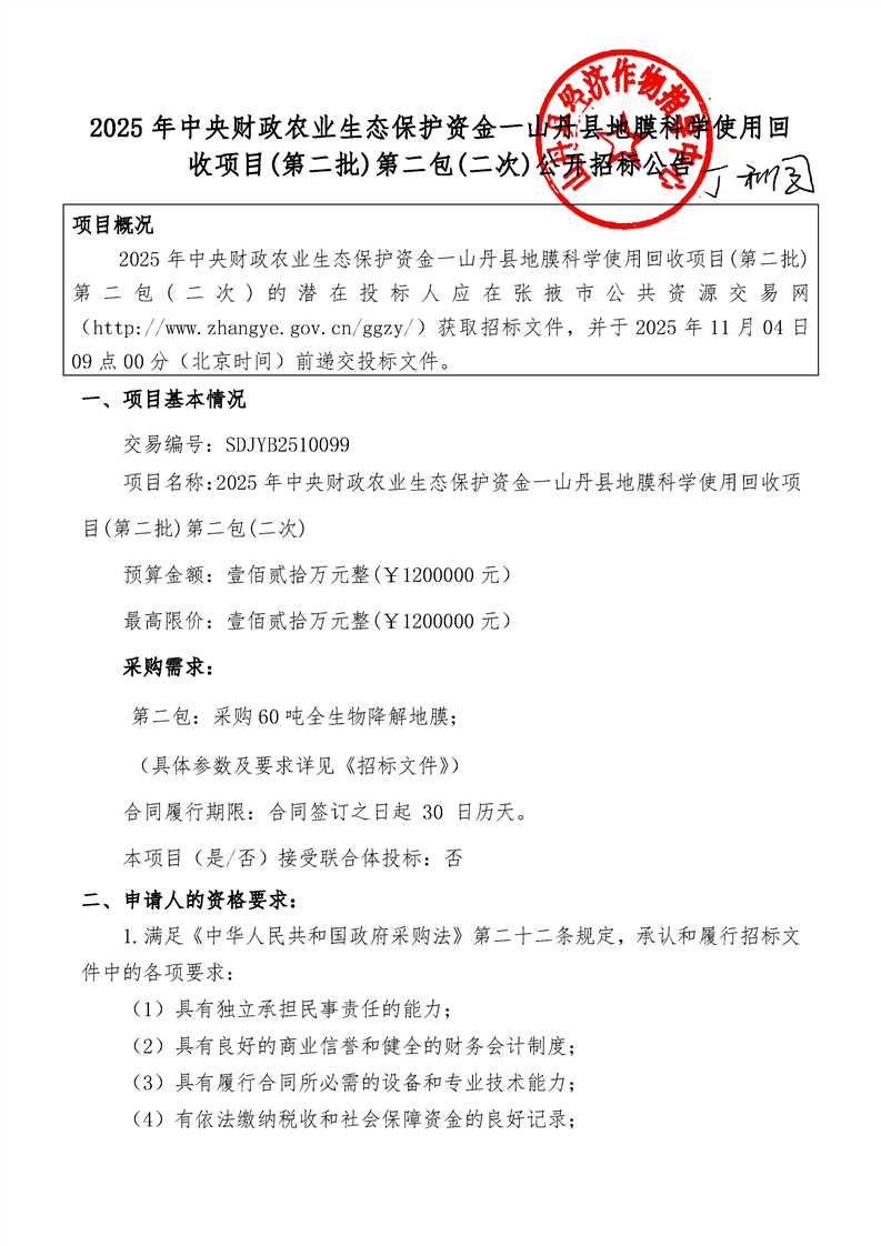 2025年中央财政农业生态保护资金一山丹县地膜科学使用回收项目(第二批)第二包(二次)