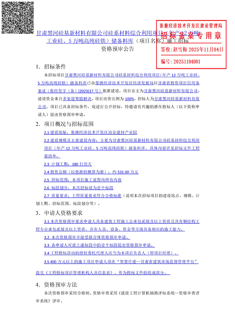甘肃黑河硅基新材料有限公司硅系材料综合利用项目(年产12万吨工业硅、5万吨高纯硅铁)储备料库