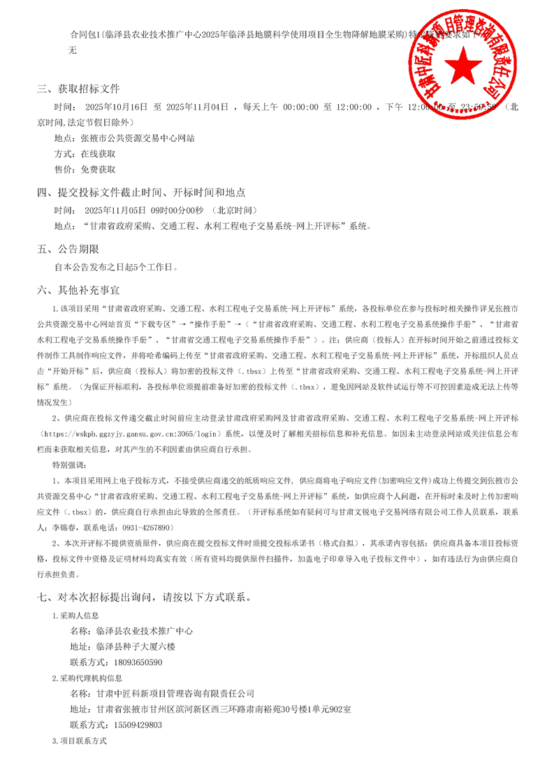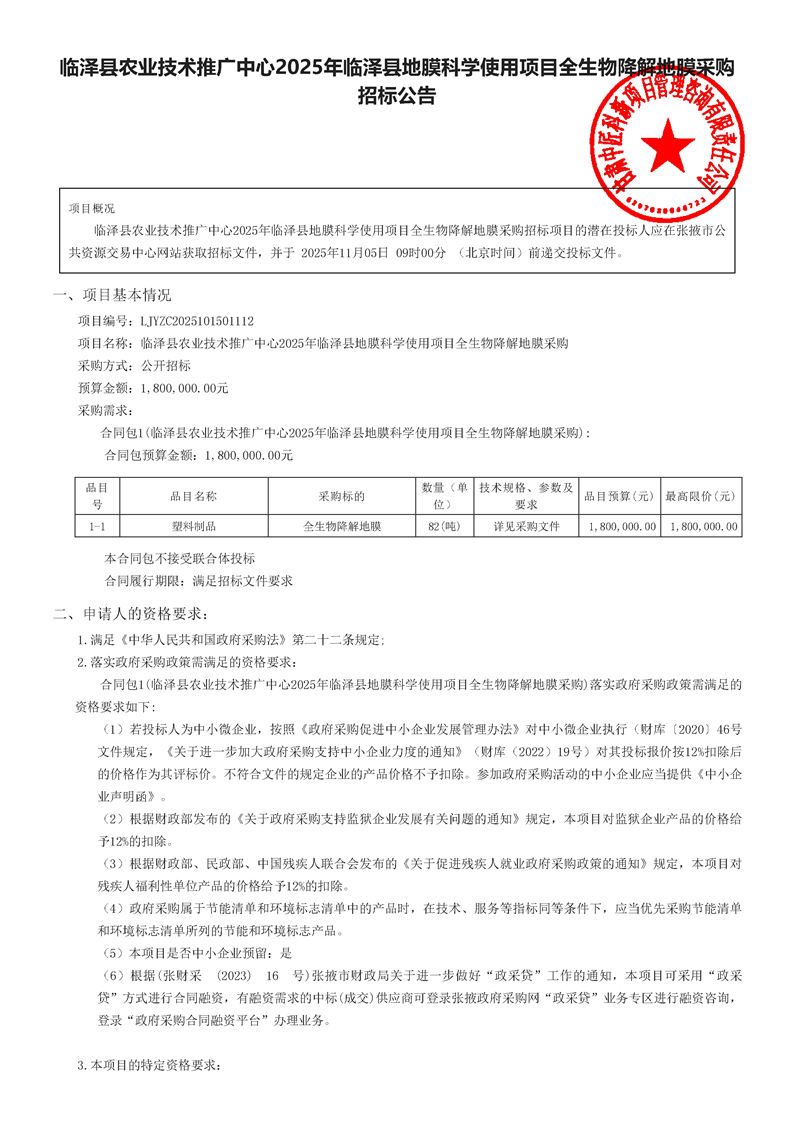 临泽县农业技术推广中心2025年临泽县地膜科学使用项目全生物降解地膜采购公开招标公告