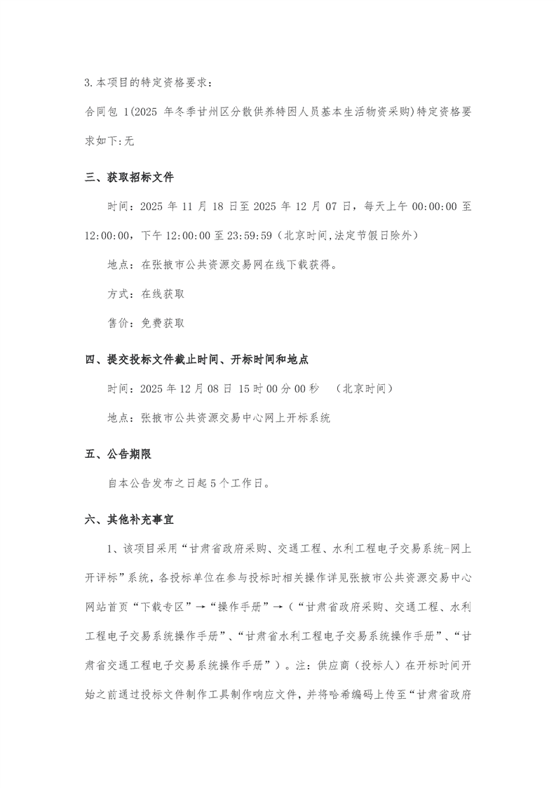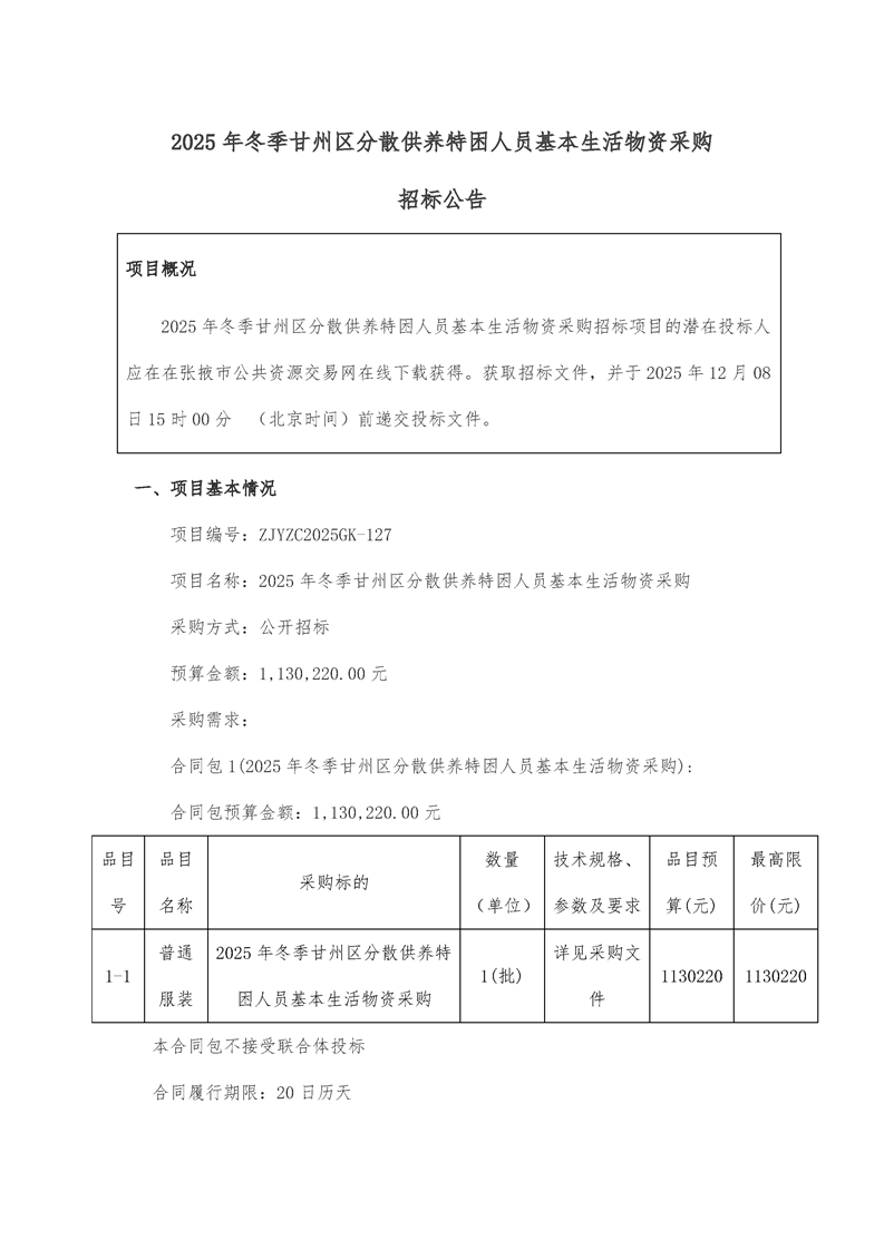 > 2025年冬季甘州区分散供养特困人员基本生活物资采购招标公告