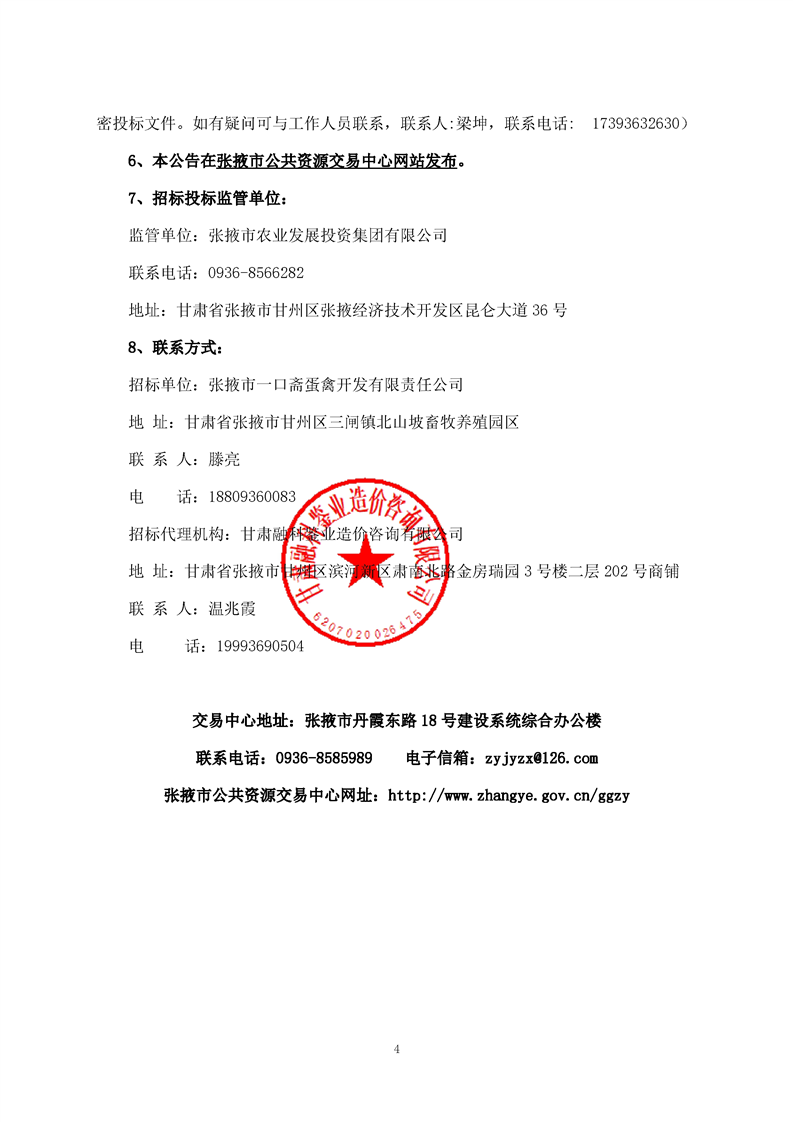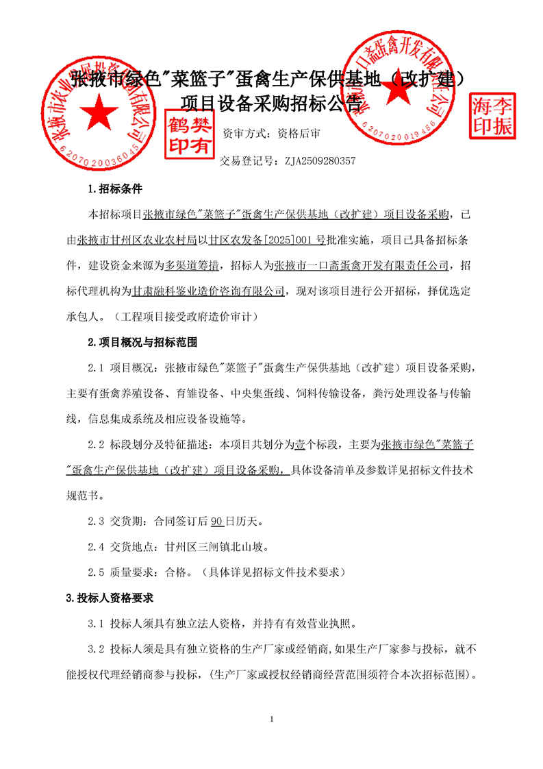 张掖市绿色菜篮子蛋禽生产保供基地(改扩建)项目设备采购招标公告