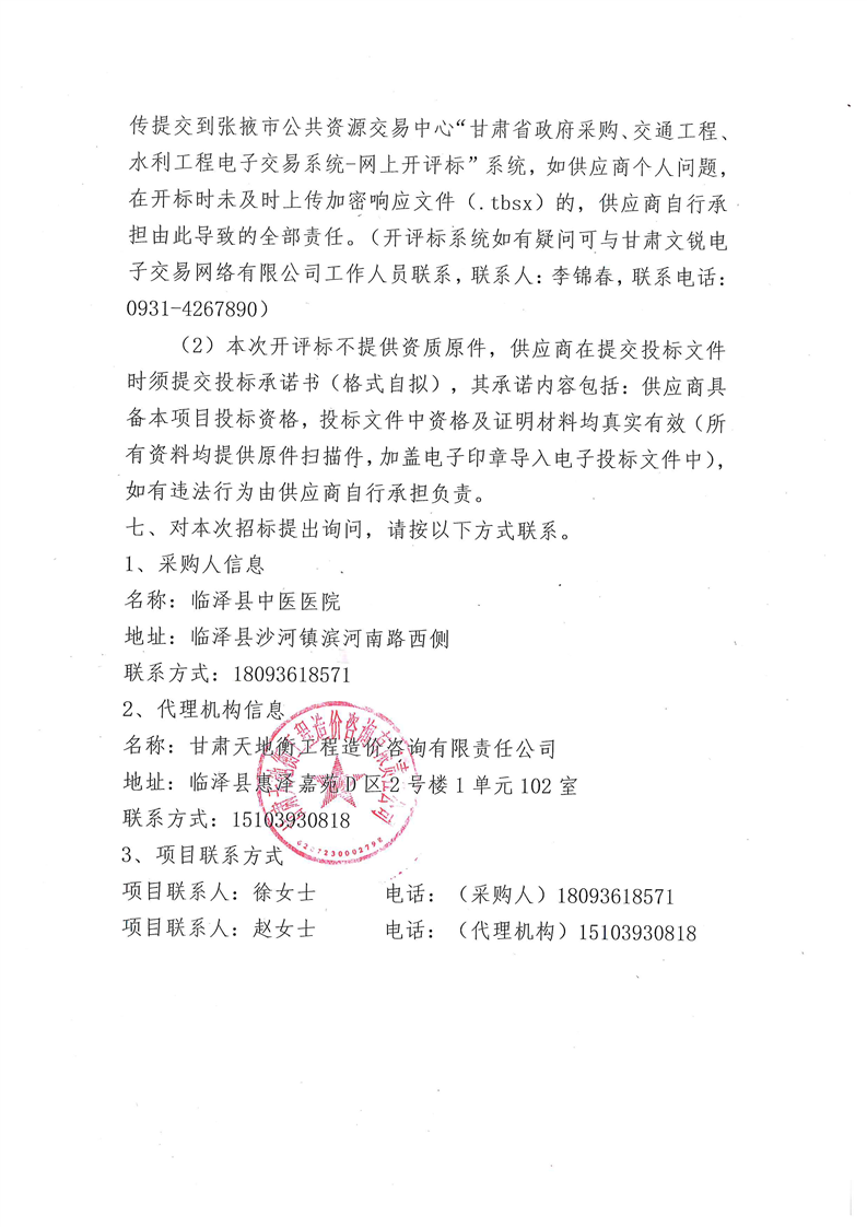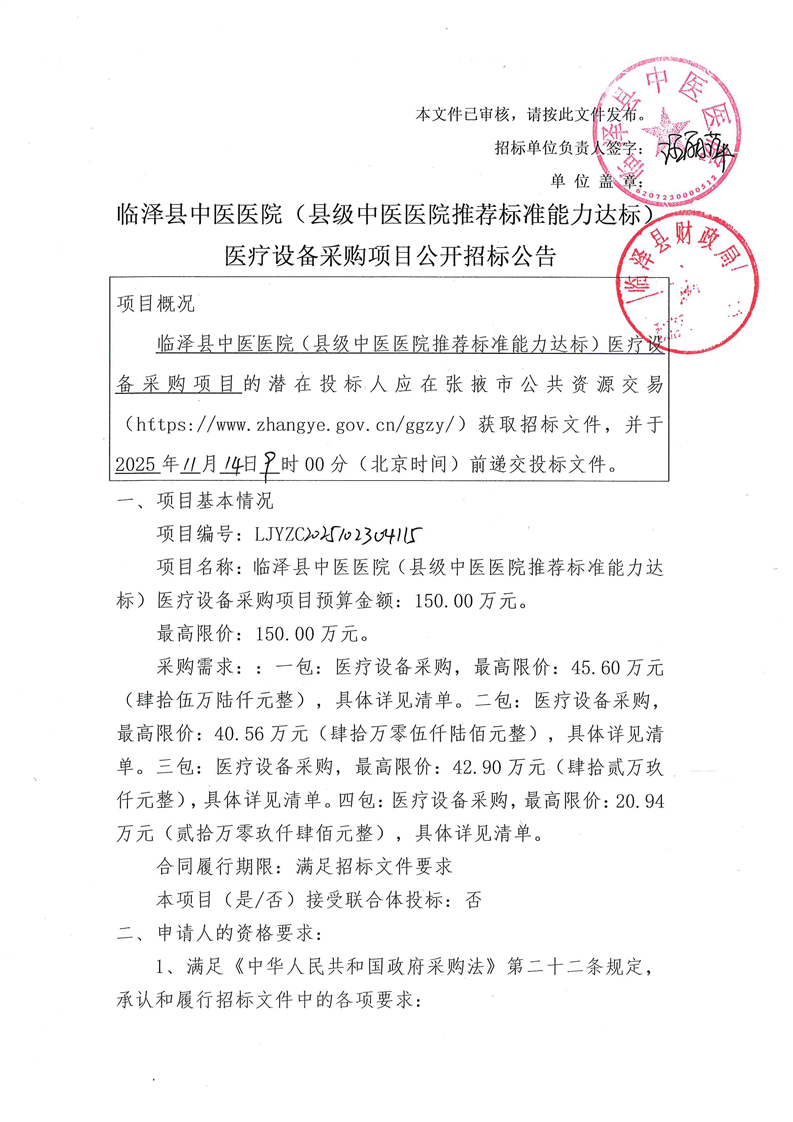 临泽县中医医院(县级中医医院推荐标准能力达标)医疗设备采购项目招标公告
