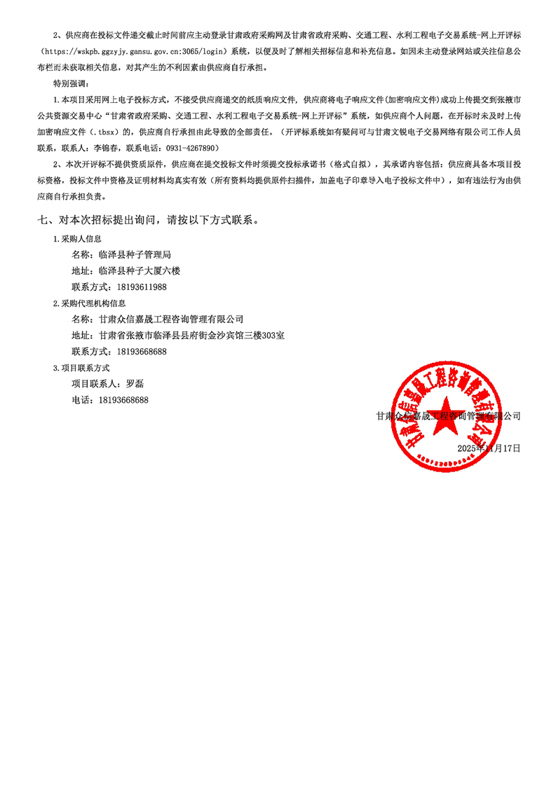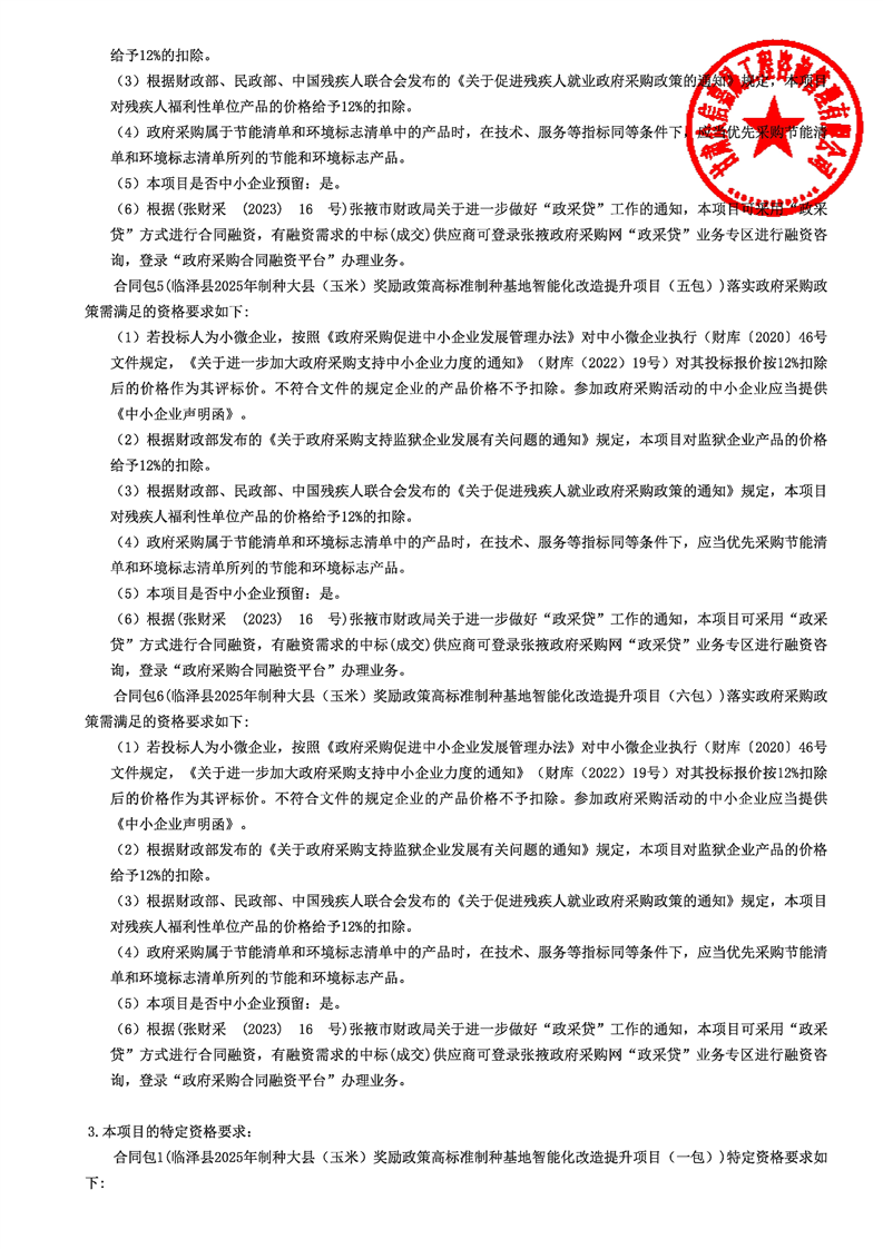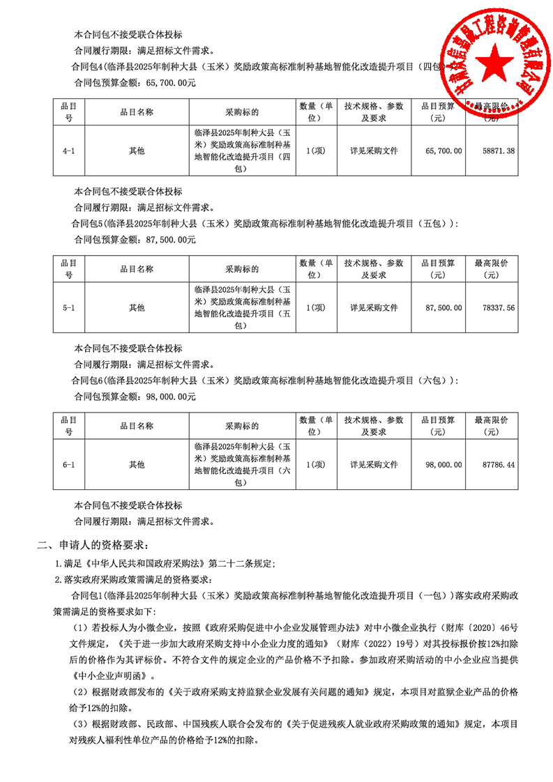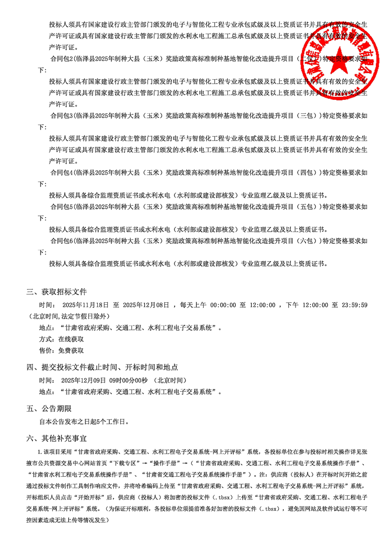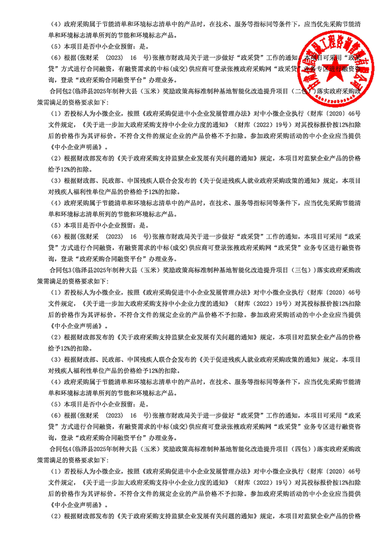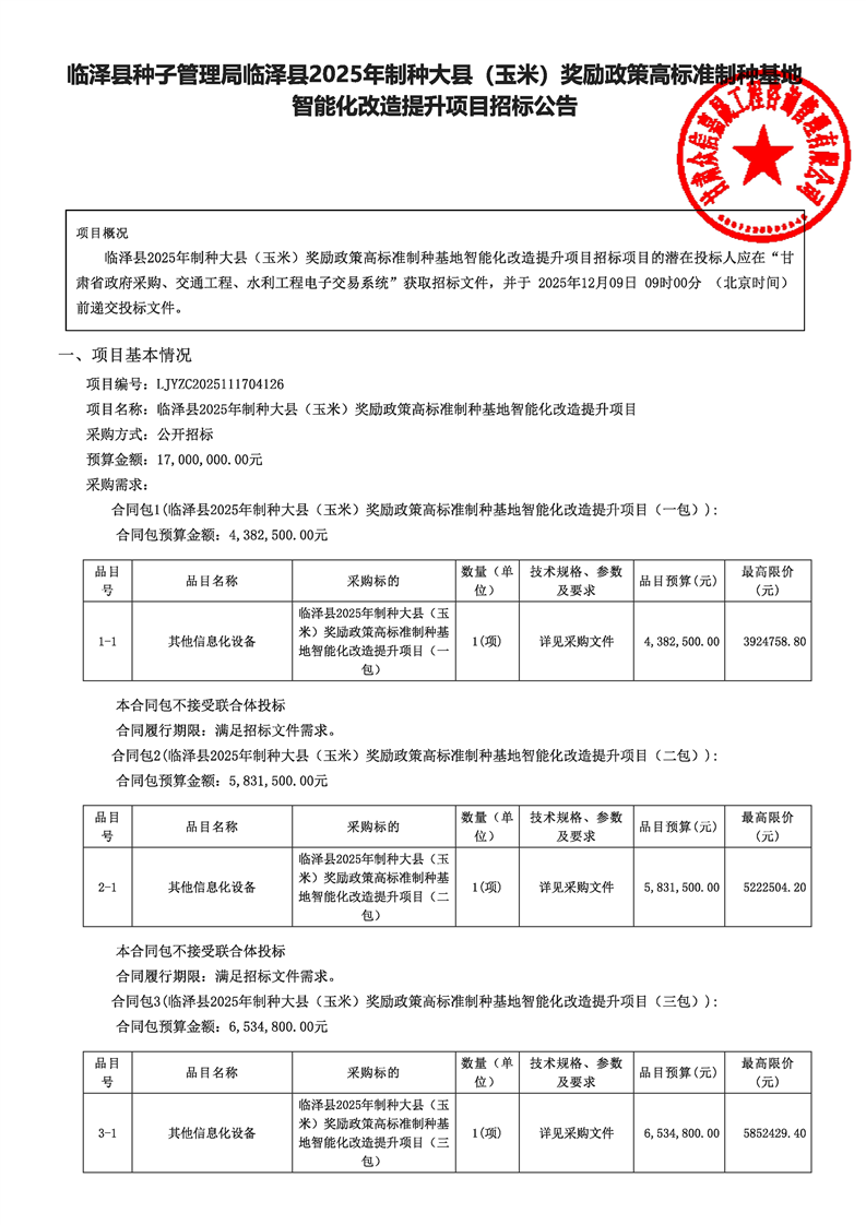 临泽县2025年制种大县(玉米)奖励政策高标准制种基地智能化改造提升项目公开招标公告