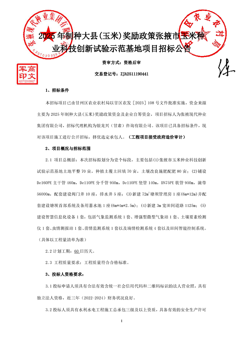 > 2025年制种大县(玉米)奖励政策张掖市玉米种业科技创新试验示范基地项目