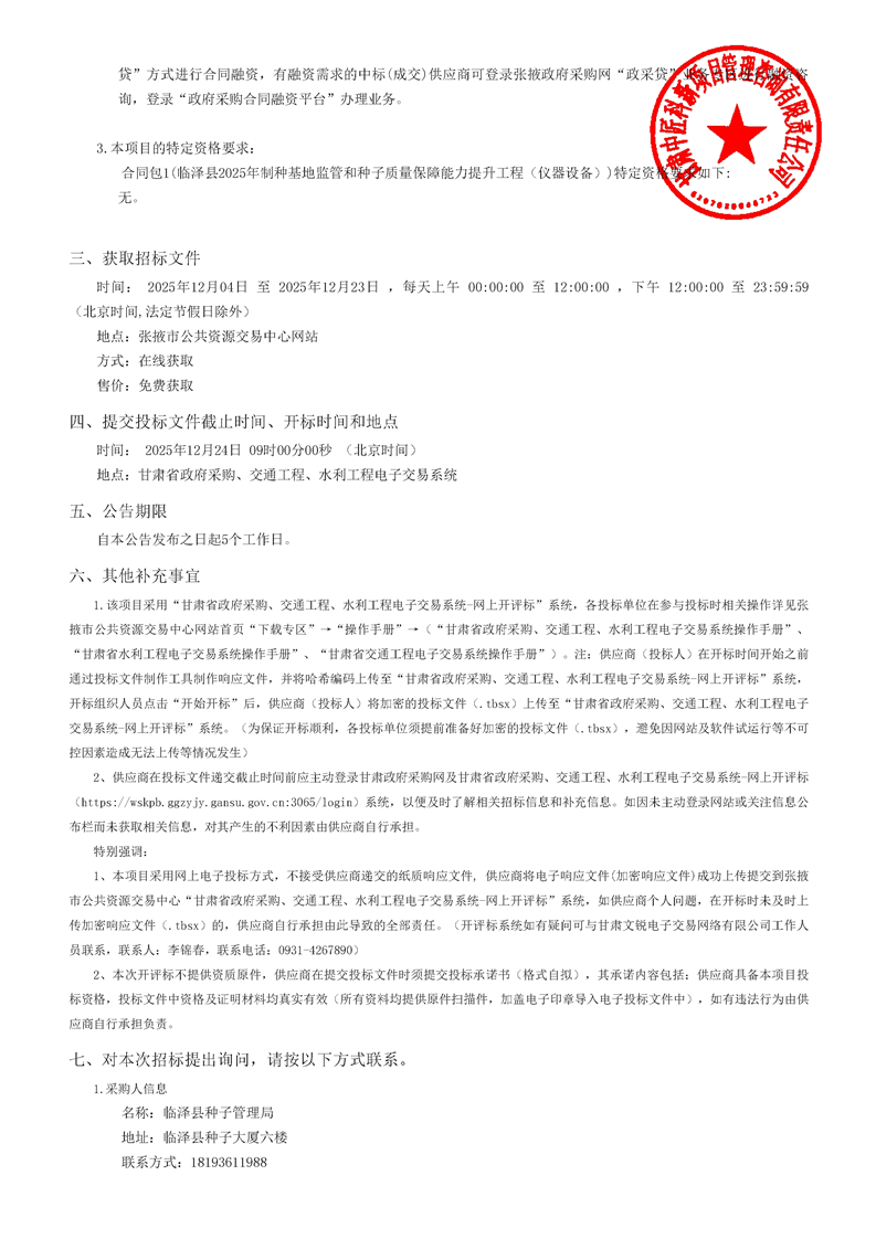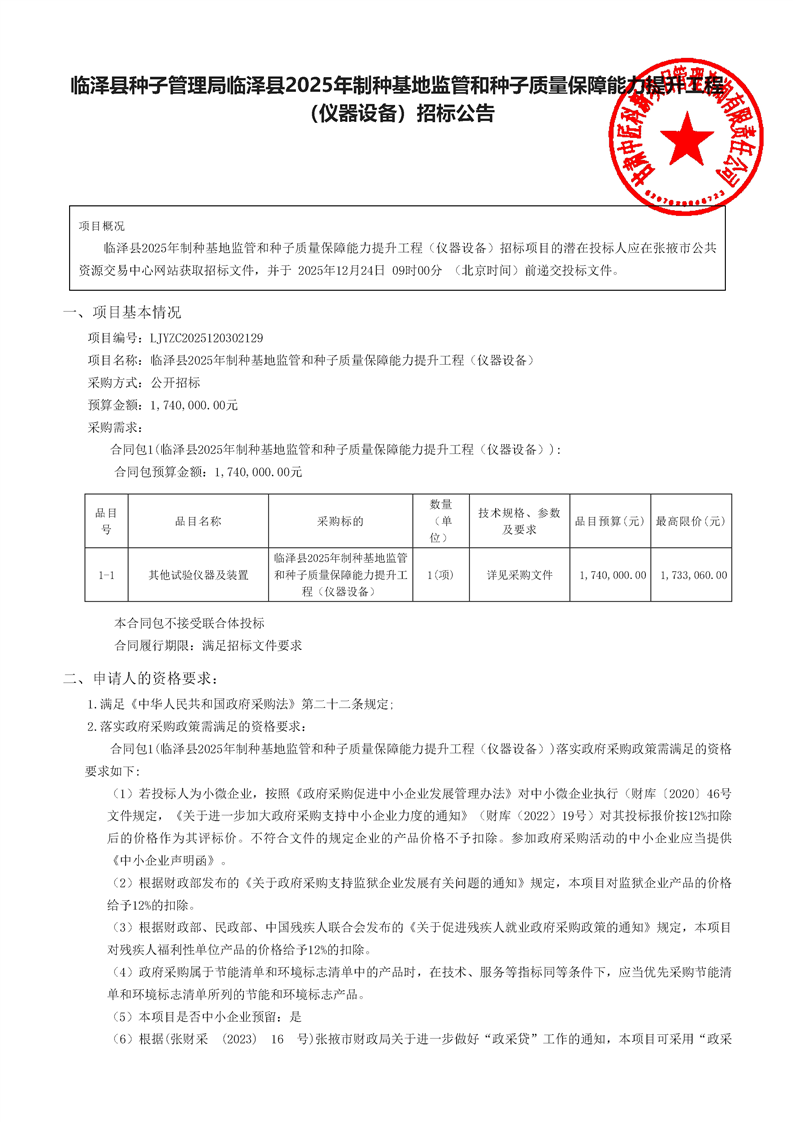 临泽县2025年制种基地监管和种子质量保障能力提升工程(仪器设备)招标公告